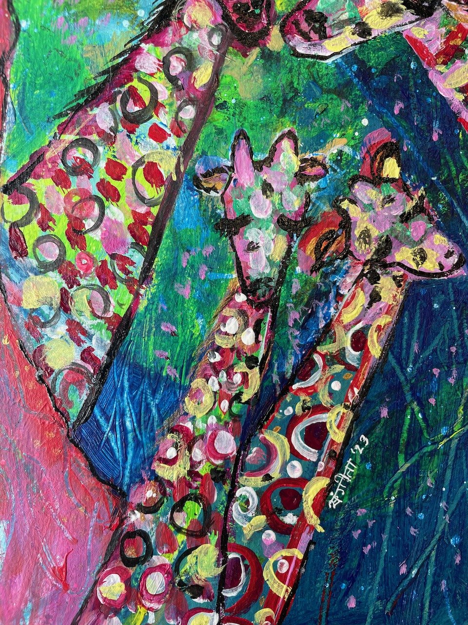 Funky, abstracted, and colour-bursting giraffe painting inspired from the giraffes at the London ZSL zoo. The work is titled after The Rolling Stones song Heaven.