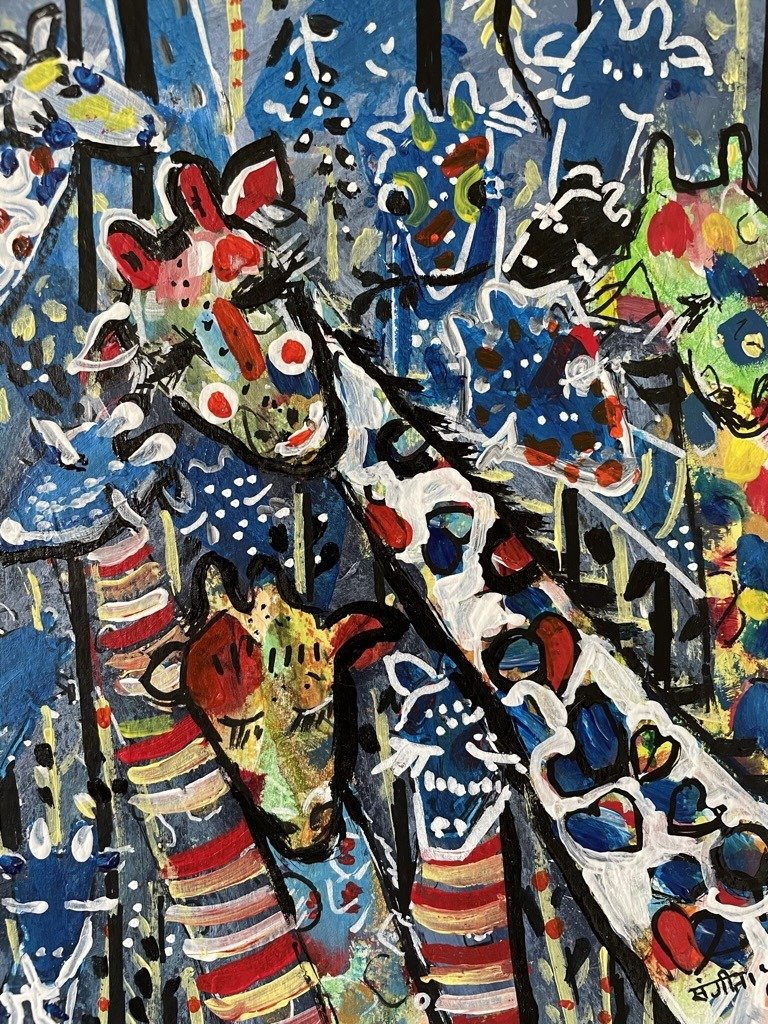 Funky, abstracted, and colour-bursting giraffe painting inspired from the giraffes at the London ZSL zoo. The work is titled after The Rolling Stones song Honky Tonk Women.