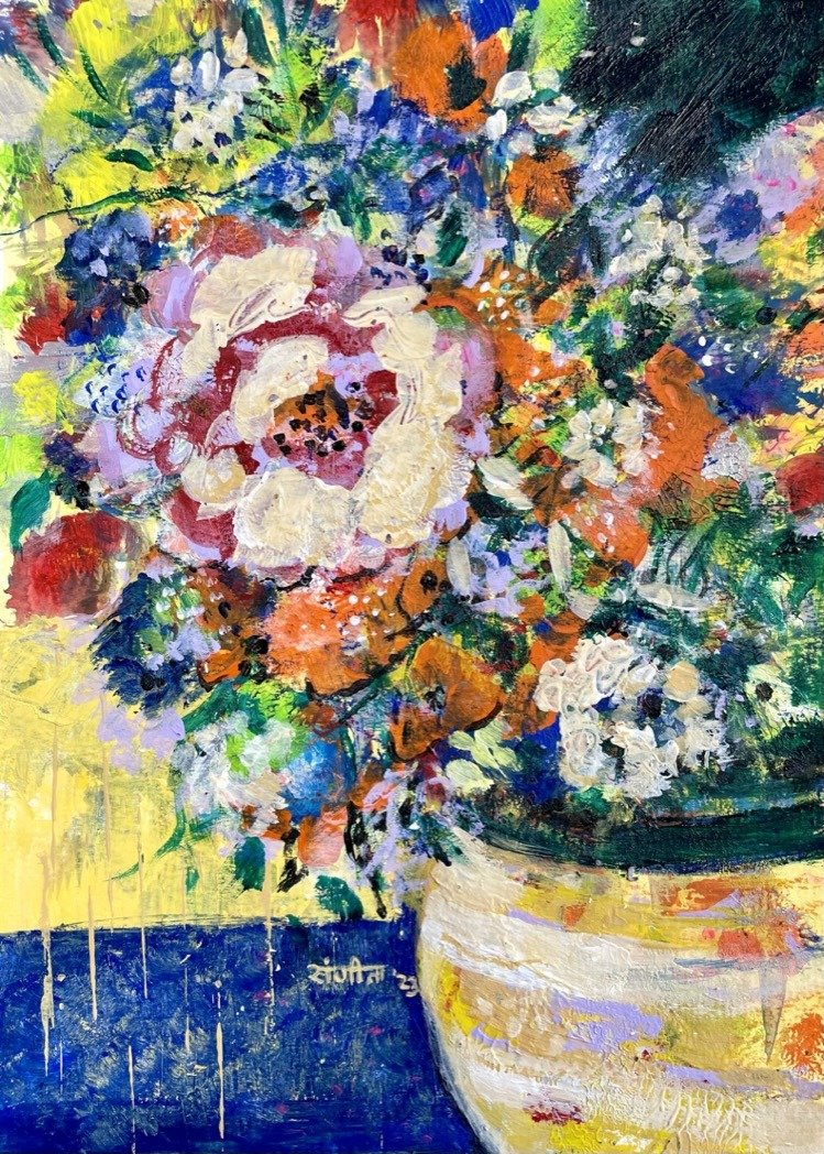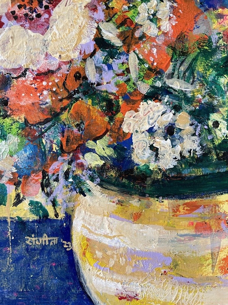 This is a closer look at a flower vase painting. It is an impression of summer day flowers in vase with the use of yellow warm tones.