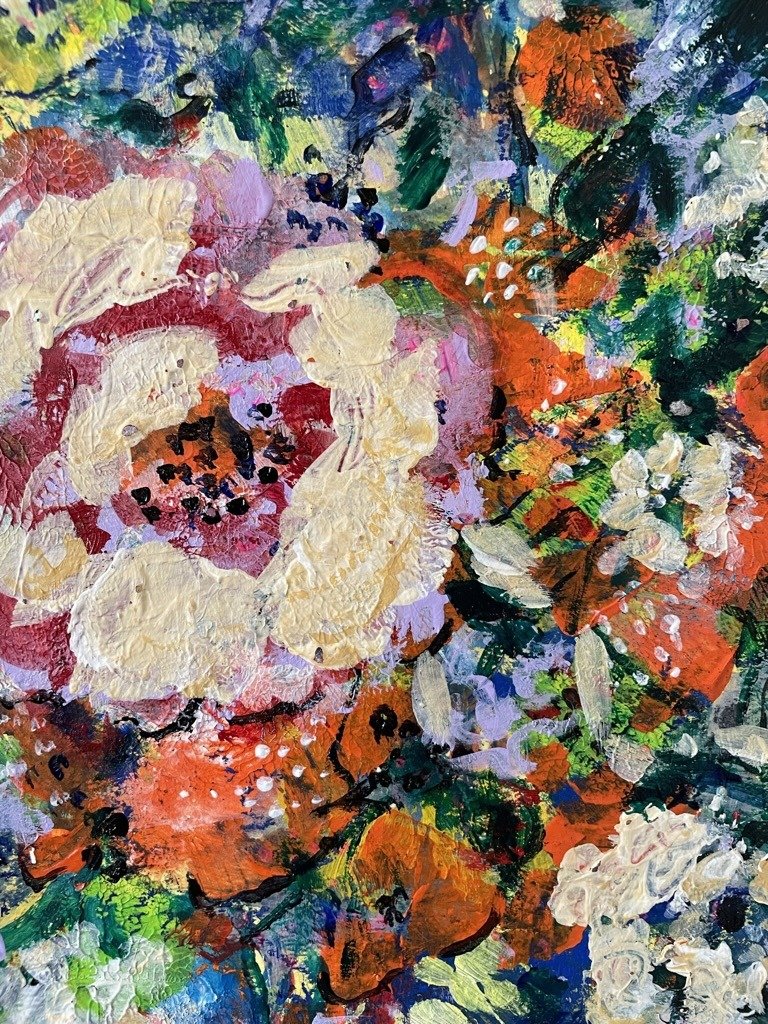 Immersive vibrant flowers in vase painting available in print. The piece was titles after The Rolling Stones song Fingerprint File.